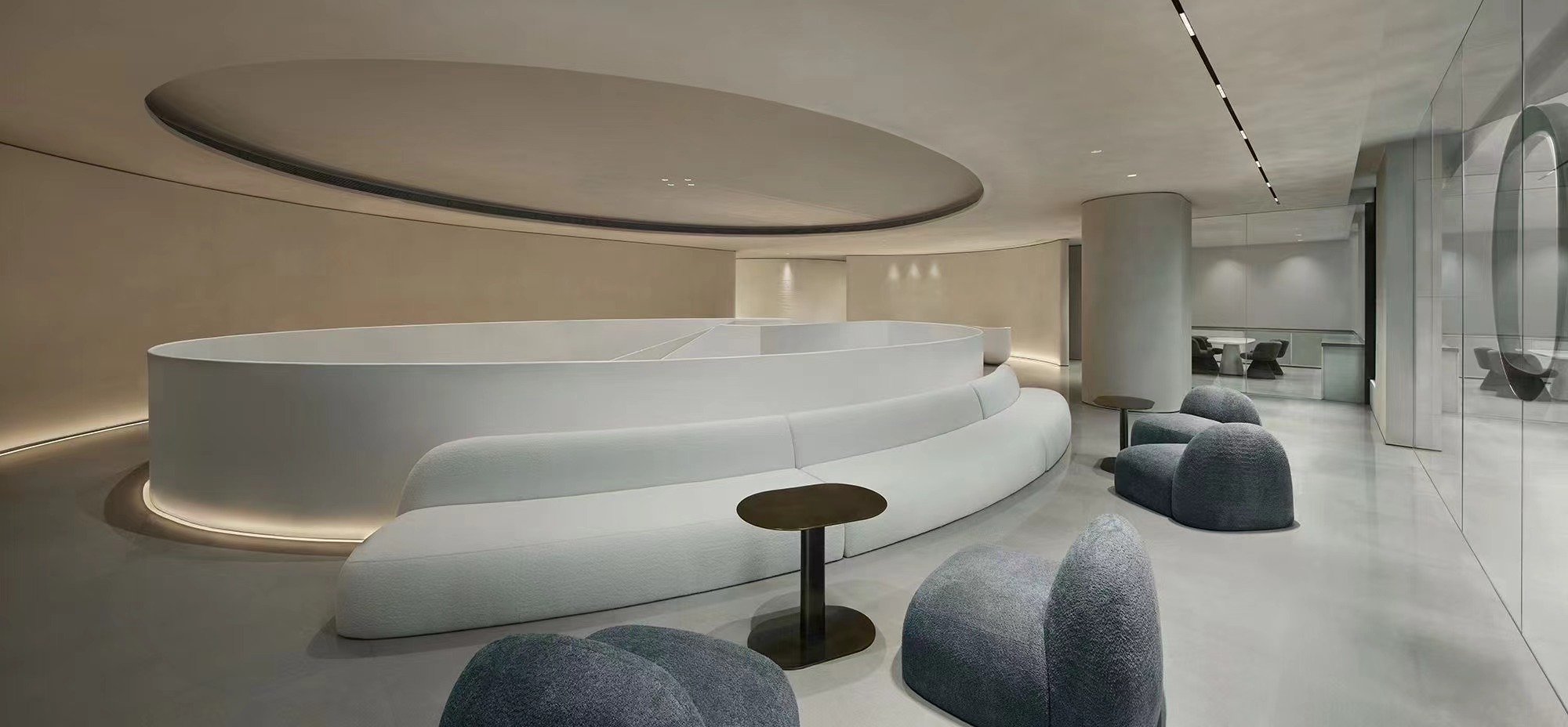 في الفضاء، حاول وصف وتصوير الأشياء غير الملموسة في التصميم، باستخدام الأشكال المادية للكشف عن التفكير الثقافي على المستوى الروحي، وتشكيل جو غير ملموس يؤثر على اللمس والشم والسمع.التطويق هو شكل مثير للاهتمام من الفضاء الذي لا يحدد العالم الخارجي فحسب، بل يبني العالم الداخلي أيضًا.إنه يلغي الحدود بين المساحة الطبية والمرضى وهذا الهدوء يتخلل كل التفاصيل من الداخل إلى الخارج، مما يوقظ وعينا بالمساحة.في منطقة الانتظار، اخترنا لينة الأرائك بأشكال ناعمة لتلبية احتياجات الراحة للمستخدمين وإضافة جو أكثر لطفًا.ليس هذا فحسب، بل إن المزيج المختار بعناية من اللونين الأزرق والأبيض يجعل منطقة الانتظار بأكملها تبدو أكثر انتعاشًا وإشراقًا، مما يضخ لمسة من الحيوية في المساحة الهادئة.إن اصطدام المعدن والنسيج يخفف من معنى العملية بمشاعر مقيدة، وهو غني بالتعبير عن التحول الروحي والمادي.